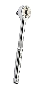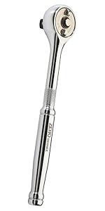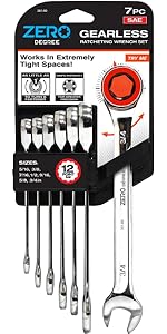 Zero Degree Gearless Ratchets are designed to work in extremely tight work spaces by gripping and turning a fastener in less than 1° of sweep. These ratchets are an ideal addition to existing automotive and mechanical tool assortments. Vertically stabilized roller bearings support a positive clutch design that engages instantly for greater control and a more precise feel. Replaces the traditional geared ratchet mechanism so there are no teeth, pawls, or springs to breakdown. Includes an easy sliding directional change mechanism and a quick socket release for fast and easy operation. Built from high carbon alloy steel for maximum strength and durability and nickel chrome plated for superior rust resistance. Meets the American Society of Mechanical Engineers (ASME B107.110) specifications for torque and life cycle. Covered by a Lifetime Warranty.
