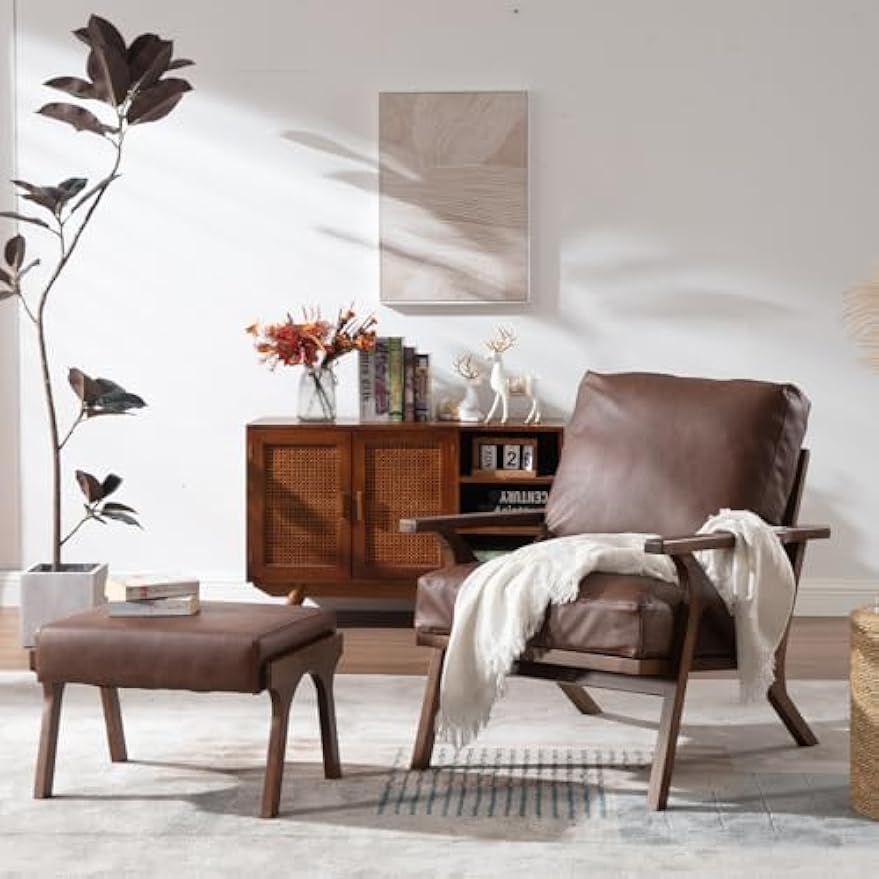 ZHENGHAO Accent Chair with Ottoman, Mid Century Modern Lounge Chair with footrest, Comfy Pu Leather Armchair for Reading/Living Room/Bedroom, Brown, Brown+ottoman